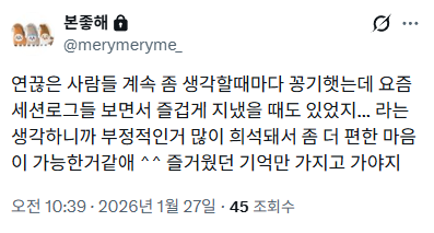 아니.. 그냥 사이 ㄱㅊ을때 했던 세션들 볼때는 걍 웃기기만했는데 와장창하기 직전에 했던 세션에서 집중못하고 걍 삐그덕대는게 다 보여가지고 ㅋㅋㅋㅋㅋㅋㅋㅋㅋㅋㅋㅋㅋㅋㅋ 안웃겨서 피곤해졌음 그때 감정들 올라와서 아 ㅋㅋㅋㅋㅋㅋ ㅠㅠ 아 피곤해...............